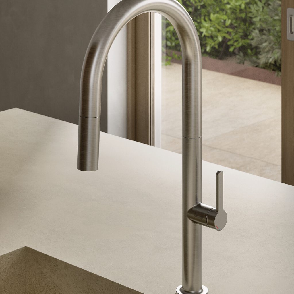 Ein besonderes Highlight ist die herausziehbare Handbrause bei den Serien KLUDI-REEF und KLUDI-AUREA: Dank eines innovativen Ausziehsystems mit automatischem Zurückführen der Handbrause in den Auslauf entfällt der klassische Brauseschlauch mit Gegengewicht unter dem Spülbecken. Dadurch wird nicht nur Platz gespart, sondern auch die Installation erheblich vereinfacht – das System benötigt lediglich zwei flexible Schläuche.